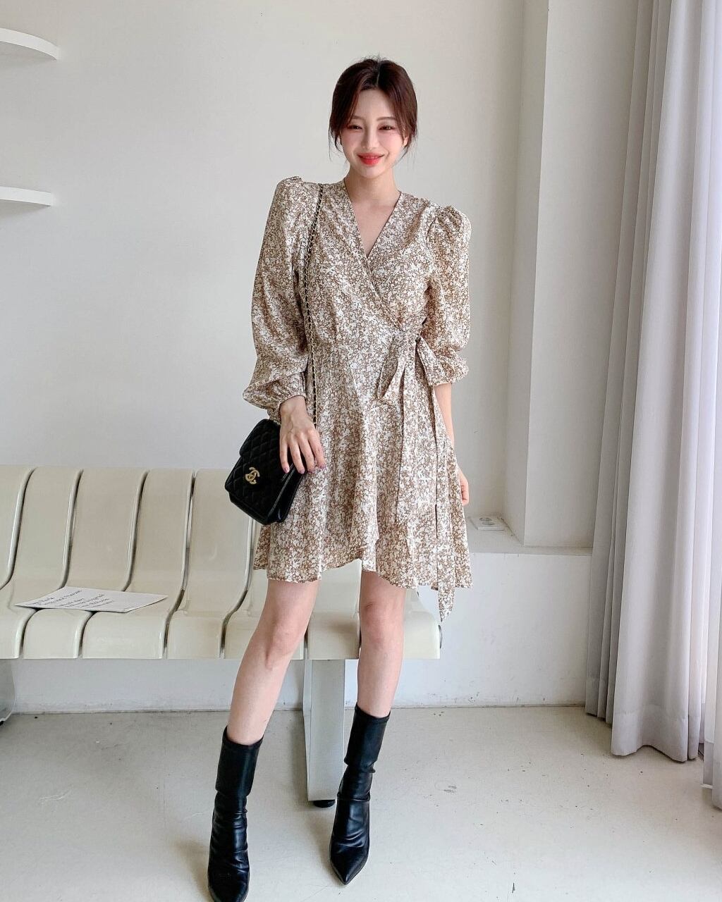 一枚でキレイにスッキリ見える子花柄ワンピース♪パワーショルダースリーブで小顔効果抜群◎