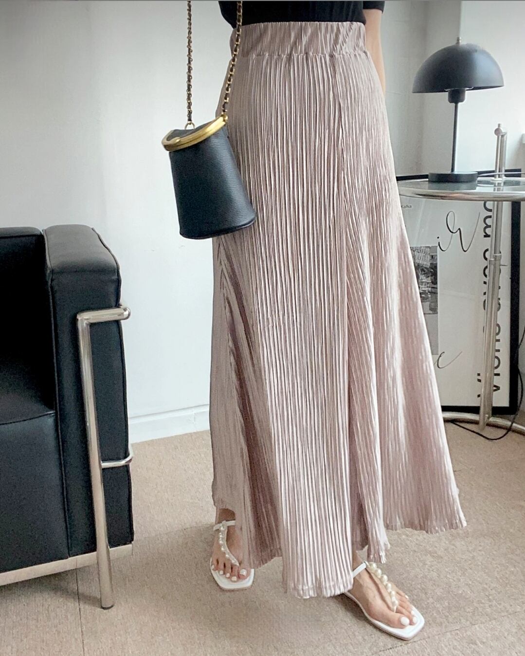 細かいプリーツ 光沢 フレアロングスカート /MNBR 1